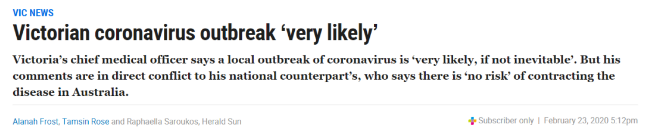 而維多利亞州首席衛生官表示:"全球冠狀病毒大流行盡管不是必然發生的,但也是極有可能的。"