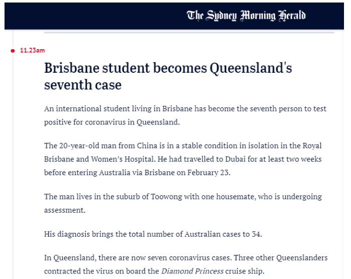 這名20歲的中國學(xué)生就讀于昆士蘭大學(xué),在迪拜停留了至少14天,而后于2月23日通過布里斯班進(jìn)入澳洲。他在2天后的25日,開始出現(xiàn)感染癥狀。