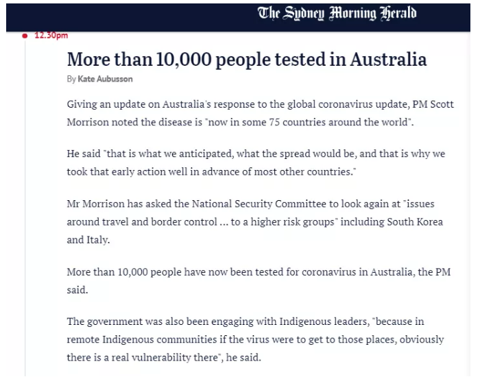 莫里森已要求國家安全委員會(National Security Committee)重新審視“有關(guān)旅行和邊境控制的問題……包括韓國和意大利在內(nèi)的高風(fēng)險(xiǎn)群體。他說,目前已經(jīng)有超過1萬人接受了冠狀病毒檢測。