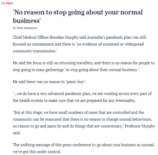 在召開的緊急發(fā)布會上,首席醫(yī)療官Brendan Murphy說,澳大利亞的計(jì)劃仍側(cè)重于控制,目前還沒有廣泛的社區(qū)傳播。
