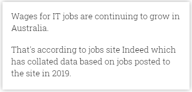 與全國整體的就業環境不同,澳大利亞的IT行業目前正處于一個高薪資且不斷增長的時期,這反映了澳洲的科技行業仍處于一個技術短缺的階段。雇主對于這些技術人員的需求量仍然很大,并且很難找到合適的人員。一旦找到合適的人員,雇主愿意支付更高的薪資來吸引人才。