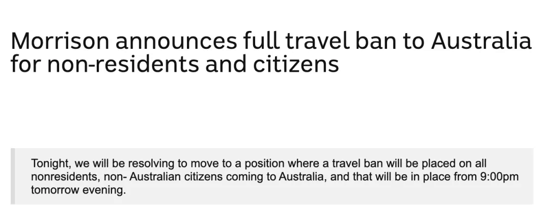 從明天(周五)晚上9:00起,所有非澳洲居民(nonresidents)和非澳洲公民(non- Australian citizens)將被禁止進(jìn)入澳大利亞,澳洲正式“封國(guó)"!