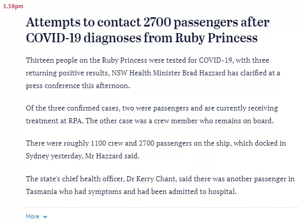 今天下午,新南威爾士州衛生部長布拉德·哈扎德在新聞發布會上澄清,13名紅寶石公主號上的乘客接受了covid19檢測,其中3人的檢測結果呈陽性。