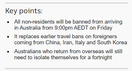 自本周澳總理宣布了室內、室外聚會人數限制后,3月19日,在全澳確診人數達到636例之后,終于迎來了莫里森總理宣布封鎖澳洲邊境的消息: