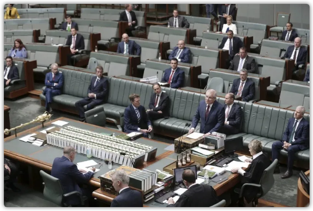 站在半空的議會會議室里,莫里森說冠狀病毒比政治更重要,需要每個澳洲人都盡到公民的職責。