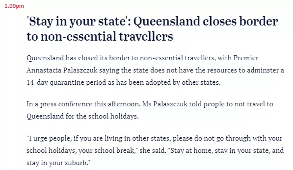 昆士蘭州已對非必要的旅客關閉了邊境,昆士蘭州總理Annastacia Palaszczuk表示,昆士蘭州沒有資源像其它州那樣,實行14天的隔離期。