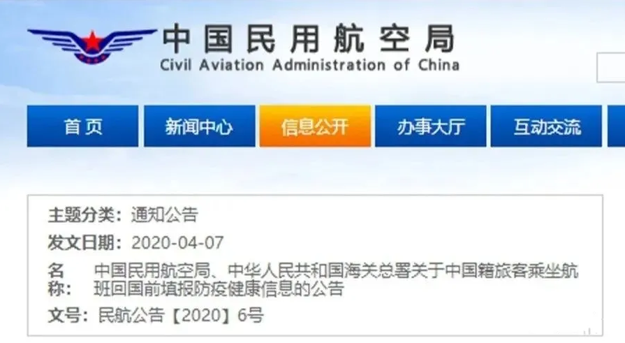 4月7日,中國民用航空局、中華人民共和國海關總署聯合發布《關于中國籍旅客乘坐航班回國前填報防疫健康信息的公告》。根據《公告》,自4月8日起,從意大利、美國、西班牙等26個國家已購買回國機票的中國籍旅客需要提前填報防疫健康信息。旅客未按要求填報的,將無法登機;填報虛假信息,將導致行程受阻,并須承擔相應法律責任。