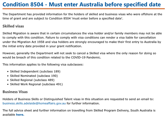 根據Migration Act 1958,不遵守簽證條件可能會導致簽證被取消。但是移民局知道某些特定情況會簽證持有人和/或家庭成員可能無法遵守8504條款。