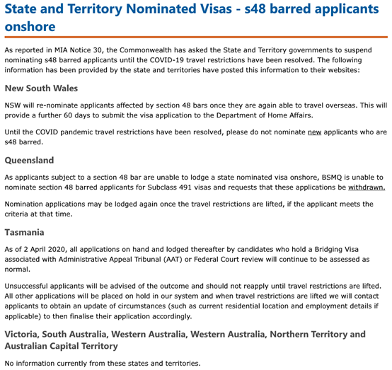 聯邦政府已要求各州和地區政府暫停提名受s48條法規限制的申請人,直到COVID-19旅行禁令解除。 各州的通知如下: