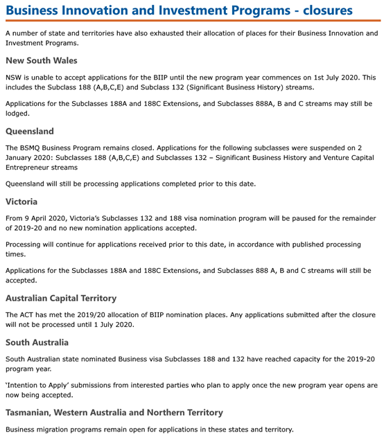 一些州和領地因為配額用完,已關閉商業移民提名通道。