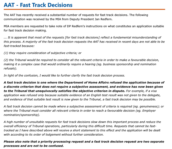 移民局如果之前是因為申請人沒有提供一些客觀材料而拒絕了簽證,現在AAT已經收到了滿足要求的客觀材料證據,那么是可以快速給出結果的。如當時沒有及時給移民局提供英文測試結果,而現在滿足要求的英文測試結果提供給AAT了,那fast track decision是有可能的。