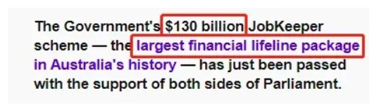 其中包括澳洲歷史上額度最高的1300億澳元JobKeeper補貼計劃,受疫情影響的企業(yè)員工每兩周可獲得1500澳元補助,持續(xù)6個月發(fā)放。