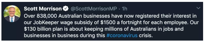 目前已有超過83.8萬澳大利亞企業(yè)申請了JobKeeper補助。