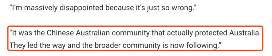 他說,“實際上正是華人群體保護了澳大利亞,他們走在了前面,現(xiàn)在更多的人在跟隨他們的腳步”。