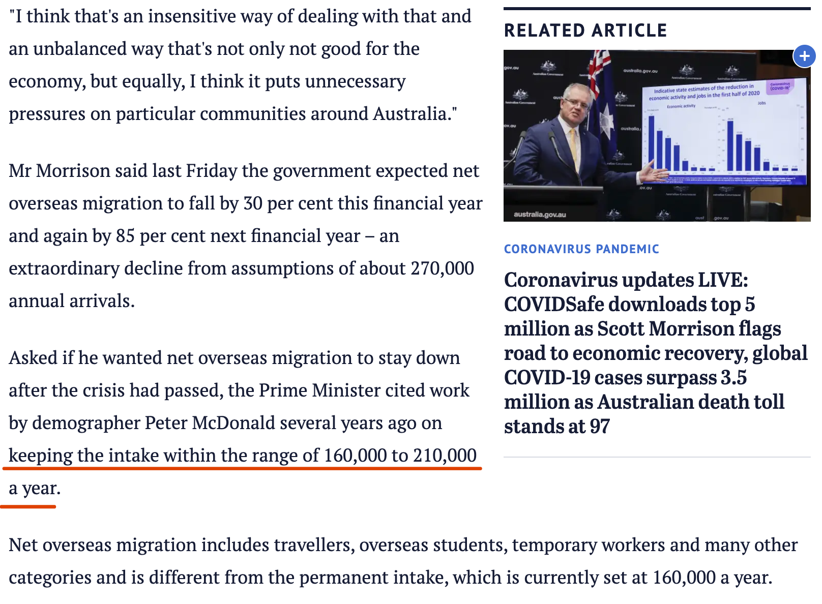 時隔幾日,昨天下午的發(fā)布會上,當莫里森再次被問到政府是否會削減下財年移民配額時,他引用了人口統(tǒng)計學家彼得·麥當勞(Peter McDonald)幾年前所做的數(shù)據(jù),即“每年的移民人數(shù)保持在16萬~21萬的范圍內(nèi)。”