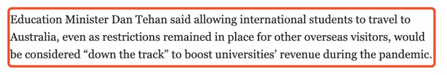 這一次,澳洲教育部長Tehan直接和澳媒說到:“我們正式考慮,讓留學(xué)生能夠不受禁令影響,提前回到澳洲上課”