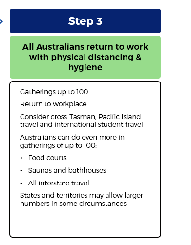 100人以上集會(huì)恢復(fù),人們回到工作場(chǎng)所,塔斯馬尼亞、太平洋區(qū)域旅行恢復(fù),國(guó)際留學(xué)生可以返澳。大型餐飲中心恢復(fù),桑拿房洗浴室恢復(fù),所有國(guó)內(nèi)旅行徹底恢復(fù)。