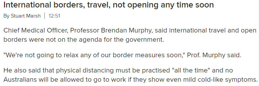 首席醫(yī)療官Brendan Murphy表示,國(guó)際旅行和開(kāi)放邊境不在此次政府的議程上,澳洲政府不會(huì)很快放松任何邊境措施。