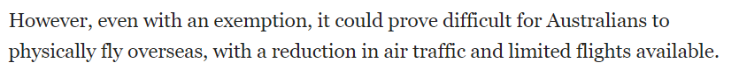 但是,即使有豁免,由于航空交通量的減少和可用航班的限制,澳洲人可能很難實(shí)際出國旅行。
