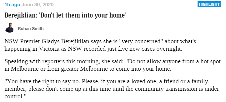 新州州長Gladys Berejiklian也警告稱,“在社區(qū)傳播得到控制前,不要讓墨爾本熱點(diǎn)地區(qū)或墨爾本地區(qū)的任何人進(jìn)你的家門!即便是你的親人,你也有權(quán)拒絕。”