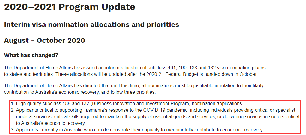塔州官方通知全文可點擊鏈接閱覽:https://www.migration.tas.gov.au/news/2020-2021_program_year_update