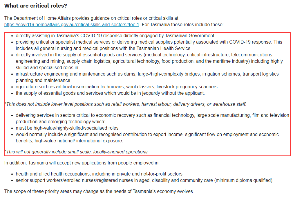 2. 有助于塔州應對COVID-19疫情的申請人,包括提供專業醫療服務,保障必須物資和服務供應,在澳洲經濟恢復的關鍵領域提供服務;