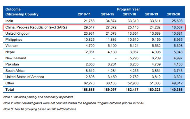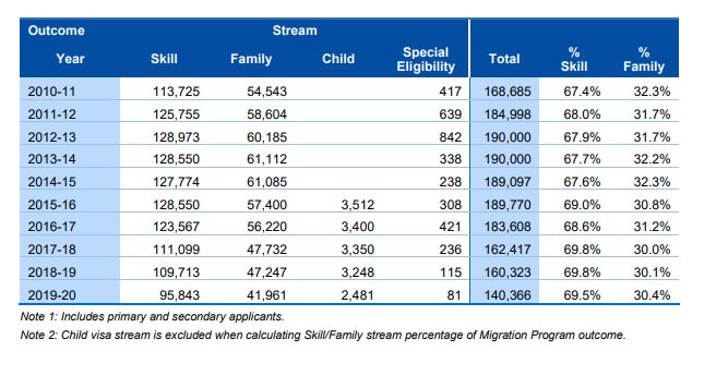 近期,澳洲公布了2019~2020財年(2019年7月1日至2020年6月30日)的移民數據: