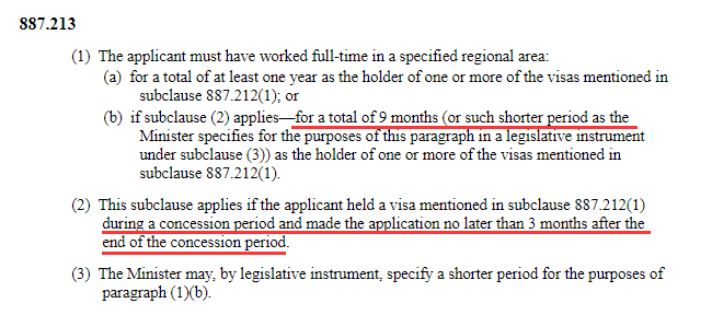 3. 偏遠(yuǎn)地區(qū)的全職工作經(jīng)驗的要求從12個月降低至9個月,不過需要申請人在concession period 結(jié)束后不超過3個月的時間內(nèi)遞交轉(zhuǎn)887簽證的申請。