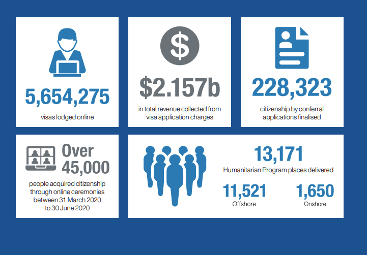 在19-20財年里,由于COVID-19相關的旅行禁令的限制,簽證的總數下降了24.3%,盡管如此,在線提交的申請百分比從18-19的93.7%上升到95.8%,并且有204,817人獲得公民身份。