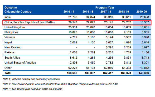2017-2018財年,中國大陸公民提交入籍申請為14707人,獲批僅1720人。2018-2019財年提交入籍申請大幅下降為7999人,但獲批人數高達7974人。
