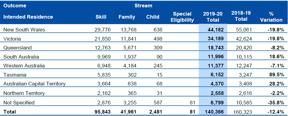 這三個州雖然簽證總數名列前三,相比2018-19財年反倒降低了很多:新州和維州紛紛降低了19.8% 將近五分之一的比例,而昆州也降低了8.2%。相比之下,南澳洲反而在崛起,簽證總數比2018-19年度上升了18.6。另外塔州數據值得關注,它的簽證數比前一財年上升了整整89.5%。