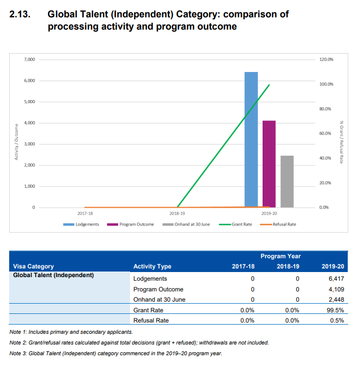 GTI簽證為申請人提供了一條快捷簡化的,優先辦理拿到澳洲永久居住的綠卡途徑。在試運營半年期間,5000個配額全部用光。截至6月30日,移民局收到總共6417份GTI申請,其中4109個申請人已經獲得PR。