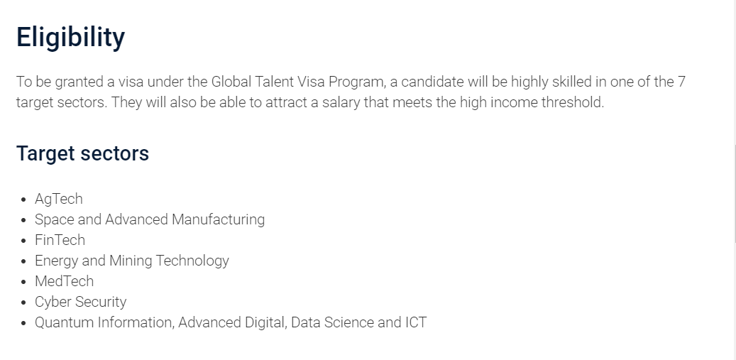 全球人才獨立計劃GTI,對申請人的行業有明確規定: