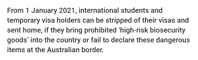 代理移民部長Alan Tudge表示,“簽證取消的決定并非輕率,違反生物安全性可能對澳大利亞造成嚴重后果,我們需要每個人都做正確的事?!?br/>“如果確實必須攜帶食物或任何其他高風險物品,則必須在入境旅客卡或機組人員聲明中申報它們。”