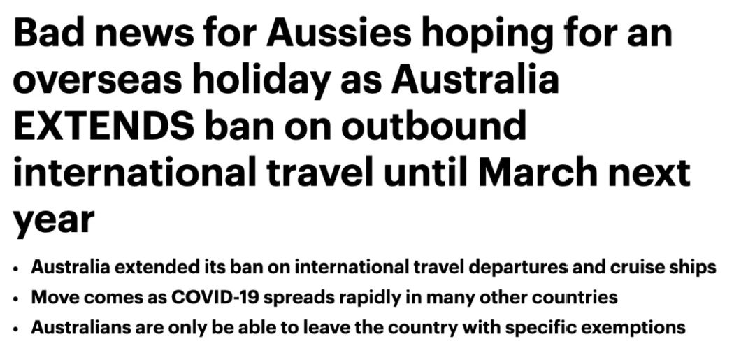 延長對澳洲人出國旅行的禁令,希望出國度假的澳大利亞人將不得不將其計劃至少再推遲3個月(原定到期時間為本月17號,現在將至明年3月17號)。