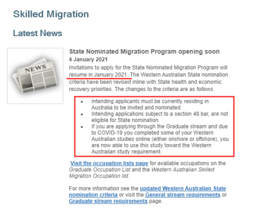 ● 西澳畢業生類別的申請者,由于新冠肺炎,在網上完成西澳大利亞大學的學習(無論是在澳洲境內還是在境外),都不會影響滿足西澳州擔保兩年學習的要求。