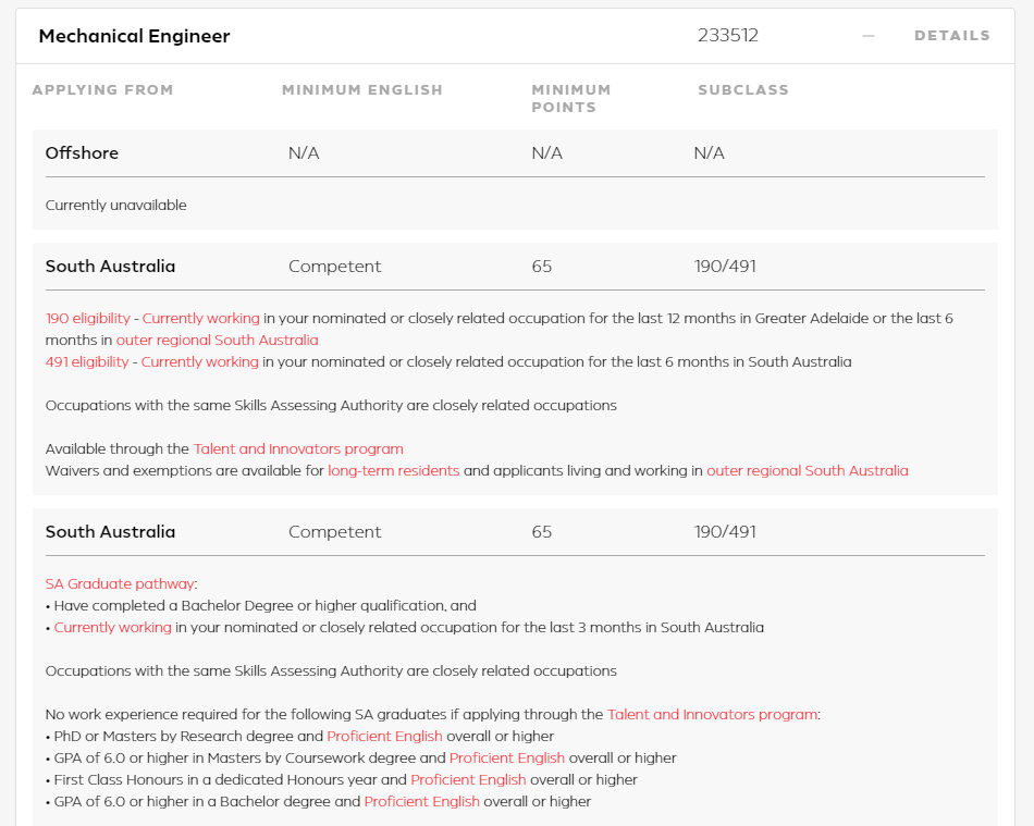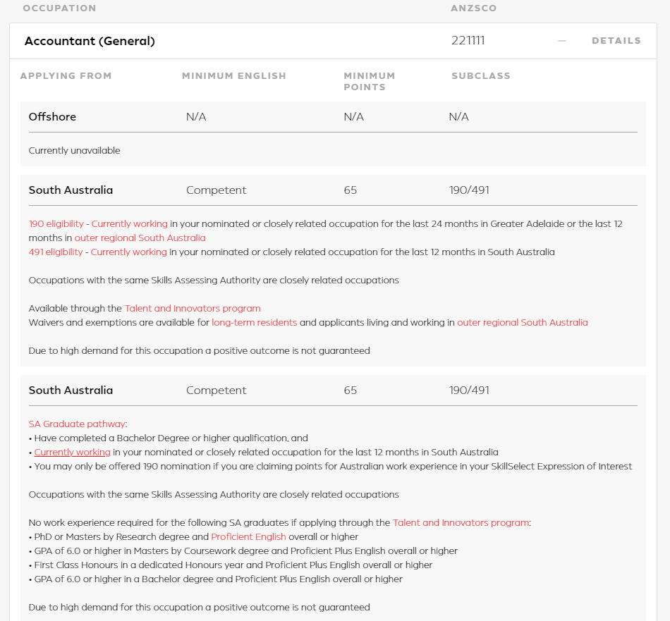 與其他州的官方網站不同的是,南澳州政府的移民網站系統是一個檢索系統。申請人輸入自己職業的ANZSCO代碼,就會出現該職業對應的具體要求。