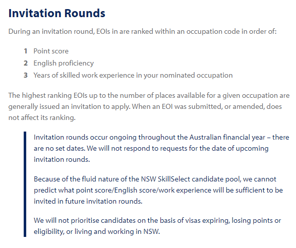 需要注意的是當(dāng)前新州190的要求除了年齡、技術(shù)評估、EOI65分,英文等常規(guī)要求外,還必須要滿足的一點(diǎn)就是申請人需在新州境內(nèi)居住。在澳洲境內(nèi)其他州以及境外的EOI暫時不會邀請。