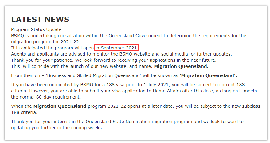 最新消息,昆州2021-22移民計劃預計將在9月開放,昆州政府目前正在討論申請要求。此外,到時昆州會review目前的州擔列表,并且從目前的Business & Skilled Migration Queensland正式改名為Migration Queesland,屆時也會有最新的官網推出。