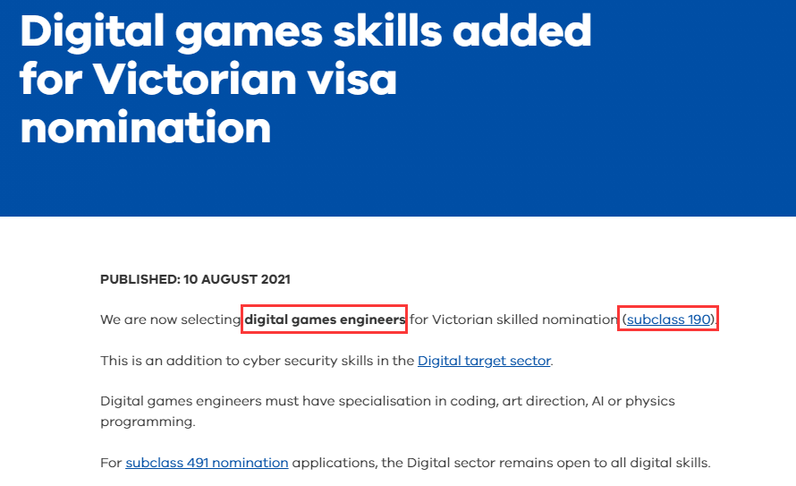 維州190提名Digital目標領域新增數字游戲工程師職業,數字游戲工程師必須具備編碼、藝術指導、人工智能或物理編程方面的專業知識。目前維州190Digital領域可接受網絡安全或數字游戲專業的申請人。