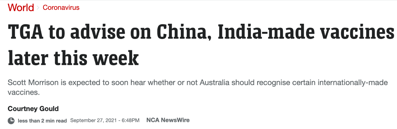 澳洲醫藥監管機構將向中國方面尋求疫苗數據,以便評估中國疫苗的有效性。