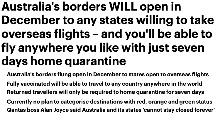 此外據報道,澳洲或許不會強加旅行泡沫,完全接種疫苗的居民可以自由飛往世界任何地方的任何國家地區!