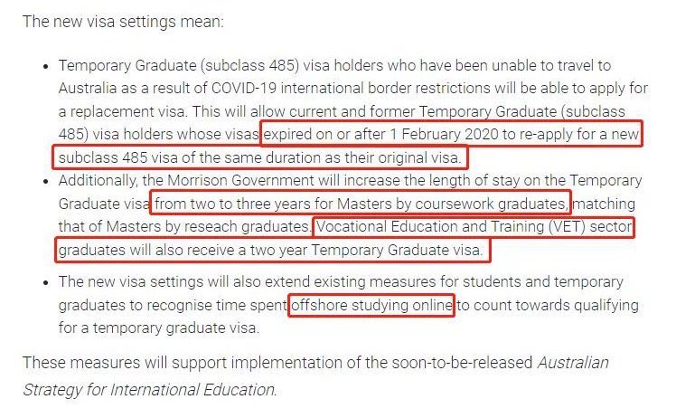 授課型研究生畢業(yè)生可申請(qǐng)的485簽證時(shí)長從2年增加到3年,與研究型碩士畢業(yè)生的一致;職業(yè)教育和培訓(xùn)(VET)部門的畢業(yè)生也將獲得2年的485簽證。