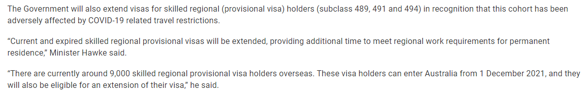 政府還將延長境外偏遠地區臨時技術移民簽證持有者(489/491/494簽證 )的簽證有效期,有效的和過期的都可以延長,來彌補489/491/494簽證持有者因新冠疫情所帶來旅行限制的不利影響,幫助他們滿足轉PR的工作、居住要求提供額外的時間。