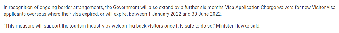 考慮到正在進行的邊境安排,政府還將為簽證將在2022年1月1日至2022年6月30日到期或即將到期的新的海外訪客簽證申請人,再延長六個月的簽證申請費豁免。