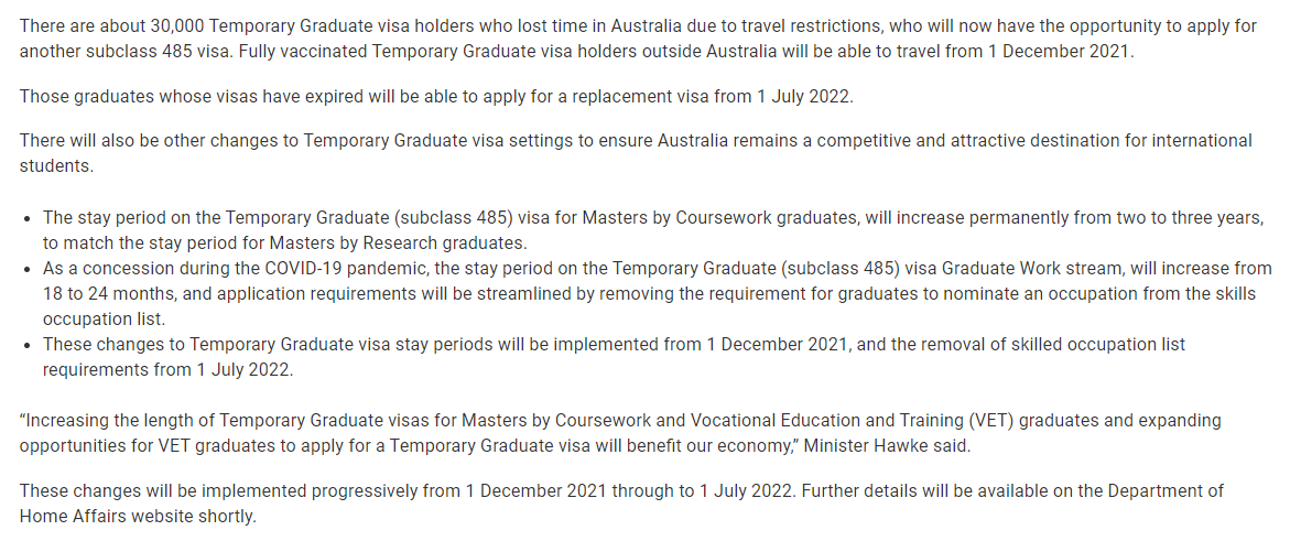 從2021年12月1日起:授課型碩士畢業后485簽證延長為3年,與研究型碩士保持一致;VET學生畢業后485簽由1.5年延長到2年;