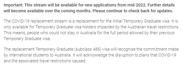 上周,移民局公布已經(jīng)持有或曾經(jīng)持有485簽證的同學(xué),只要其485簽證在2020年2月1日及之后到期,由于疫情導(dǎo)致無法入境澳洲,就可申請一個485替代簽證,有效期與原簽證相同。今日,移民局在官網(wǎng)更新了485替換簽證 (Replacement Visa) 的具體的申請要求和費用。