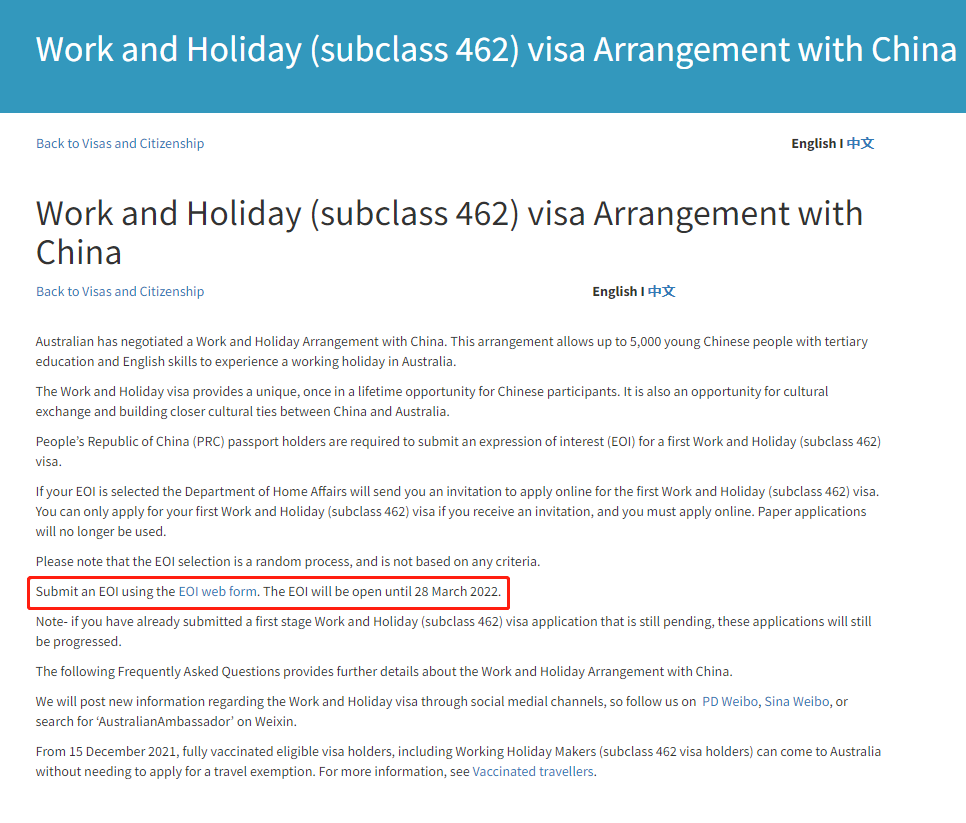 A:EOI申請將開放至2022年3月28日。下一次EOI申請開始時,將在以下網站上發布公告:https://china.embassy.gov.au/bjng/WorkandHolidaysc462FAQ.html