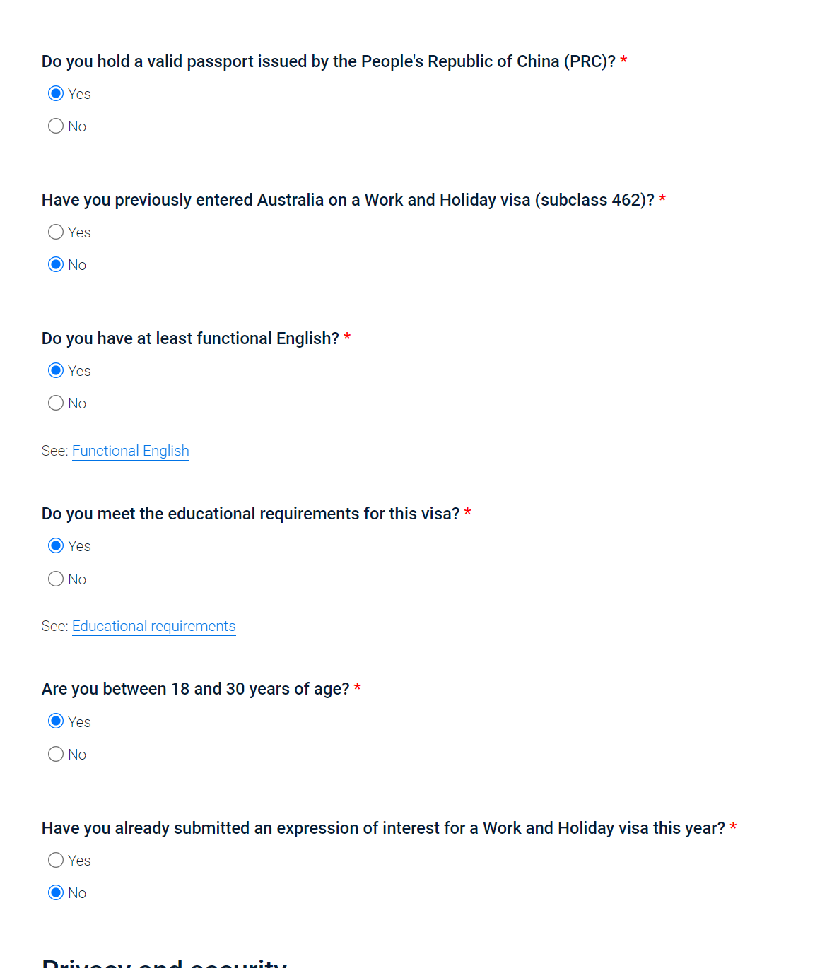 登陸網站:https://immi.homeaffairs.gov.au/form-listing/Pages/eoi-work-holiday-visa-chinese-passport-holders.aspx,填寫下列問題。