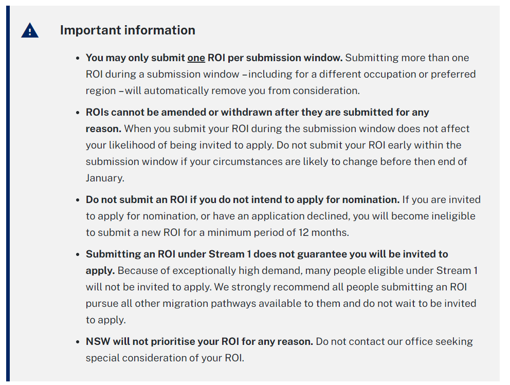 ◆通過 Stream 1 (在新州偏遠地區居住和工作)通道提交 ROI 并不能保證您會被邀請申請。新南威爾士州提名的需求遠遠超過可用名額,許多符合 Stream 1 條件的人將不會被邀請申請。所以州政府強烈建議所有提交 ROI 的人尋求所有其他適用的申請通道,不要一直等待。